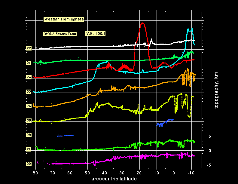 In our investigation we will be working with topographic data returned from the MOLA instrument. Data sets are often compressed horizontally so they take less space and graph more easily. We will need to keep this in mind. The graph, (right - click for detail) serves as an example. Note the V.E. 100:1. This ratio means that the vertical is exaggerated 100 times for each unit on the horizontal. For example track 24 has a huge spike structure. This is actually the profile of Olympus Mons. This broad based shield volcano returns to its true shape when you add 100 units to the horizontal for each 1 on the vertical scale.