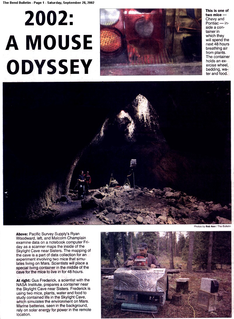 The CEMSS, a miniature bio-regenerative life support analog, will contain two female mice, and several trays of the aquatic plants lemna minor, (duckweed) and water fern, (azolla). This is an experimental analog of a hypothetical Martian Cave colony, and all environmental variables will be tracked and recorded during the length of a two-day experiment. This part of the project will investigate the feasibility of utilizing lava tube caves on Mars as possible habitats and resource locations for future human explorers. The CEMSS and its cargo spent two days in Skylight Cave, a lava tube near the Central Oregon resort of Black Butte at the end of September, 2002. The Unit was placed on a scaffold, beneath one of three unique 'hornito' openings within Skylight Cave, a moderate sized lava tube cave. Power was provided via photovoltaic solar cells charging a bank of batteries, connected to the CEMSS by an umbilical cord going into the cave. On the surface, support equipment included a portable weather station and computer data logging equipment. Click Here to view the front page photos from the Bend, Oregon "Bulletin" daily newspaper.