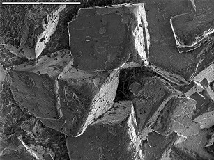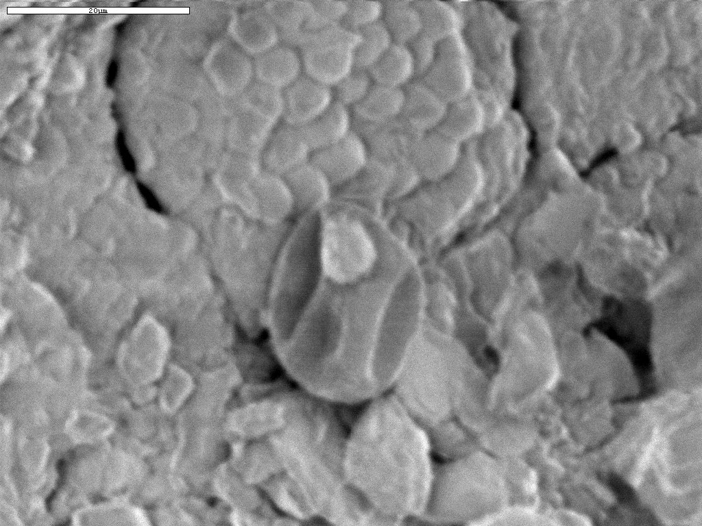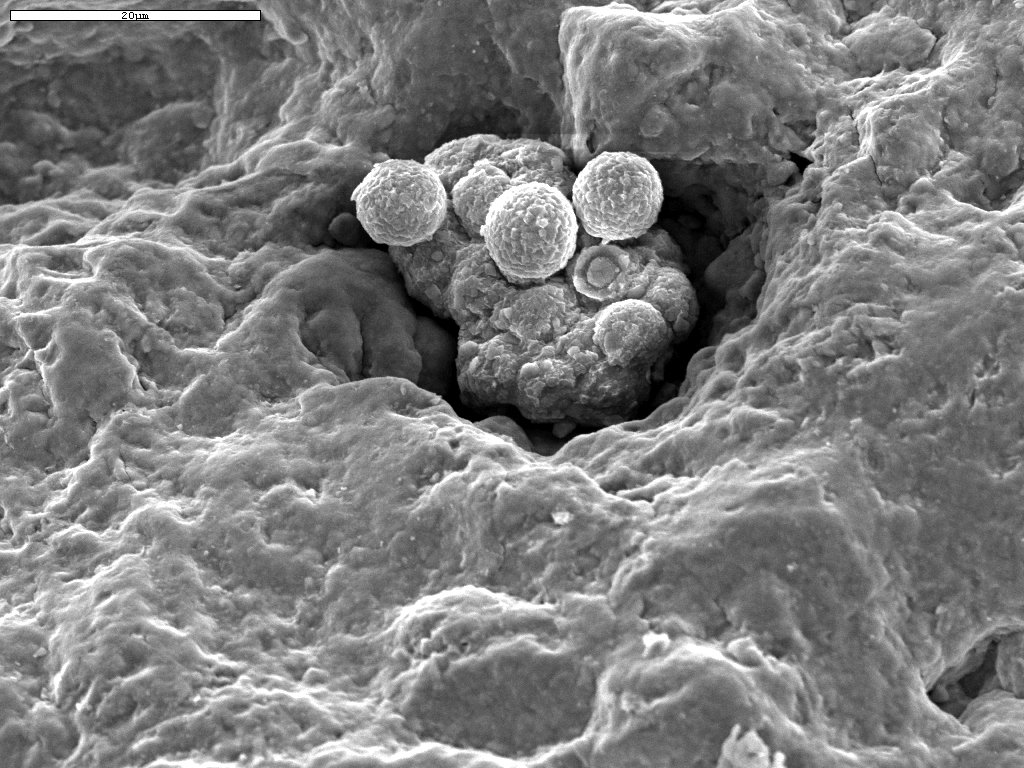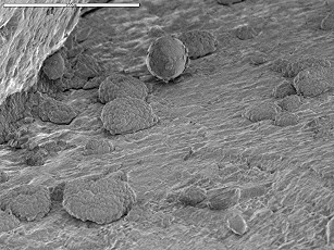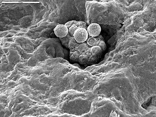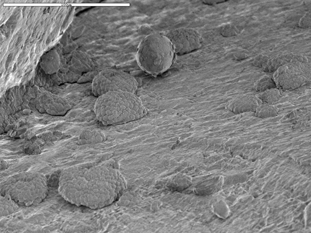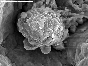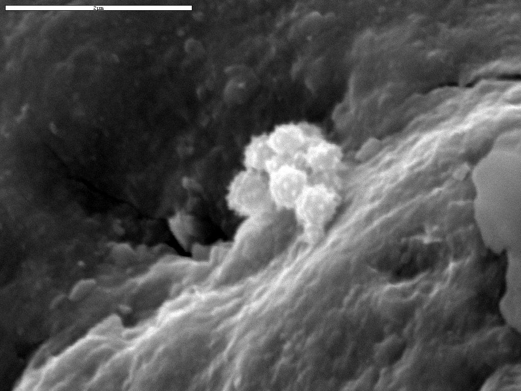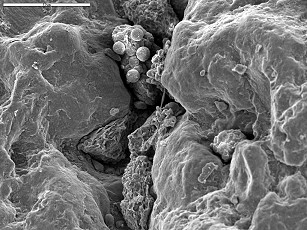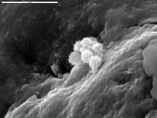 ![]() Fossil colony surface with shriveled live (recently, but now formerly!) algal cell. We had to work at low voltage with this one so the resolution isn't great. |