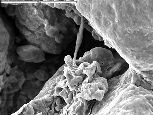 ![]() Fuzzy things closer, they are silicified FeOxide coated colonies, either bacterial, or microcolonial fungi. They are fossils, not alive, we think. |