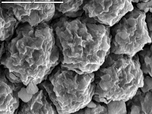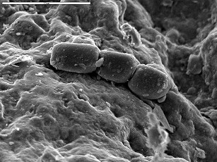 Closeup of microcolony in above image. The cells are about 4 microns in diameter. Their "wrinkly pea" appearance implies that they were very recently alive and growing before we dried them in the oven. |