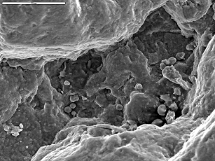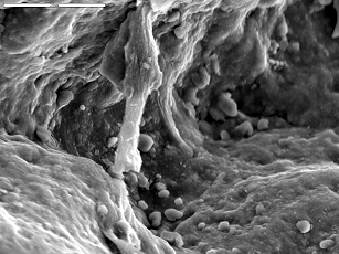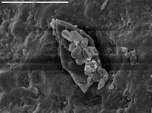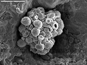 Microcolony in pit, many other cellular shapes strewn across the field of view. Couldn't get a good EDS in the pit, but did get a fairly clear indication of silicate coating. |