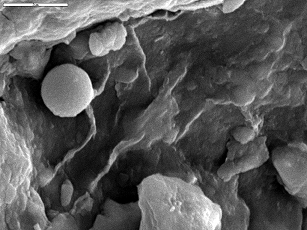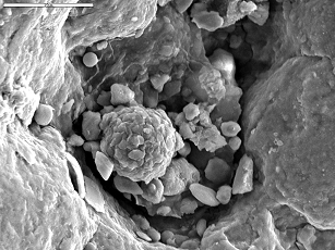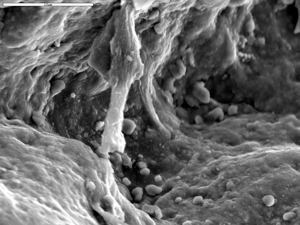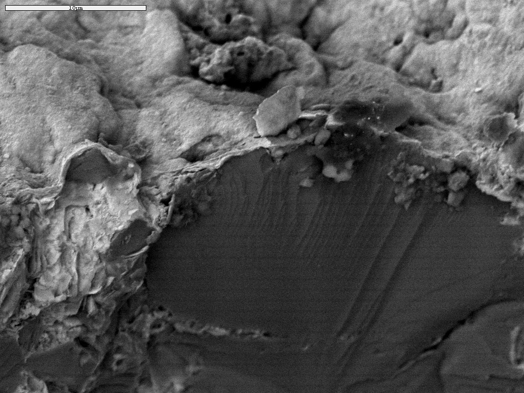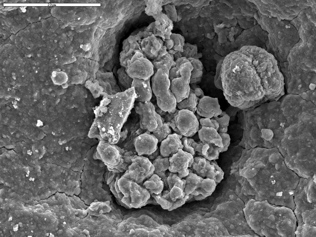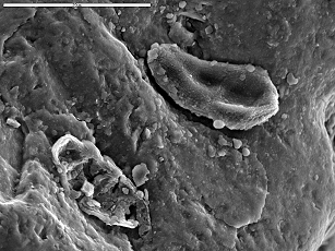 Close up of previous image. Left of field, approx. 1.6 micron juicy, carbonaceous bacterial cell. To the right of field, a more exciting find ... colony of small buried bacteria coated with biogoo and iron oxides. |