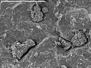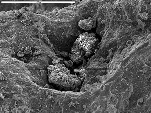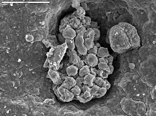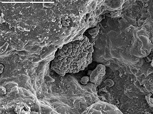 Colonies in pits including the one in the previous image. Also, many different sized and shaped cells strewn around on the surface. Some appear mineralized, some degraded. |